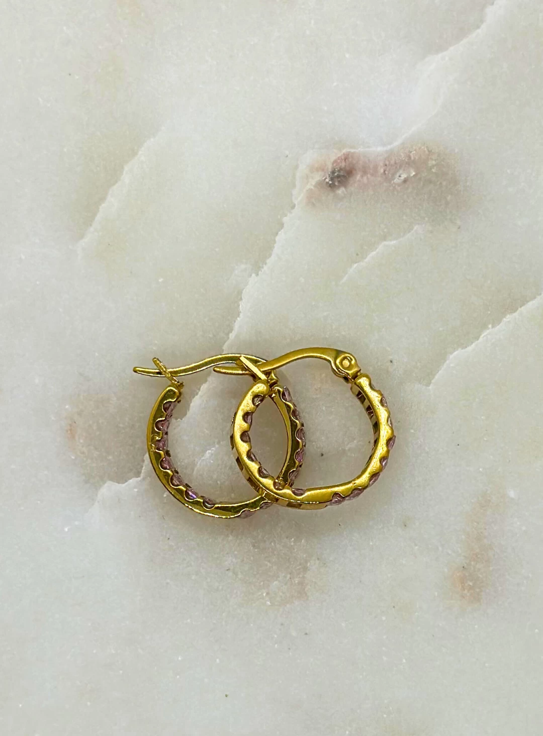 A stunning pair of gold huggie hoops featuring a a row of gorgeous pink Cubic Zurconia crystals. A luxurious look perfect for every day wear.