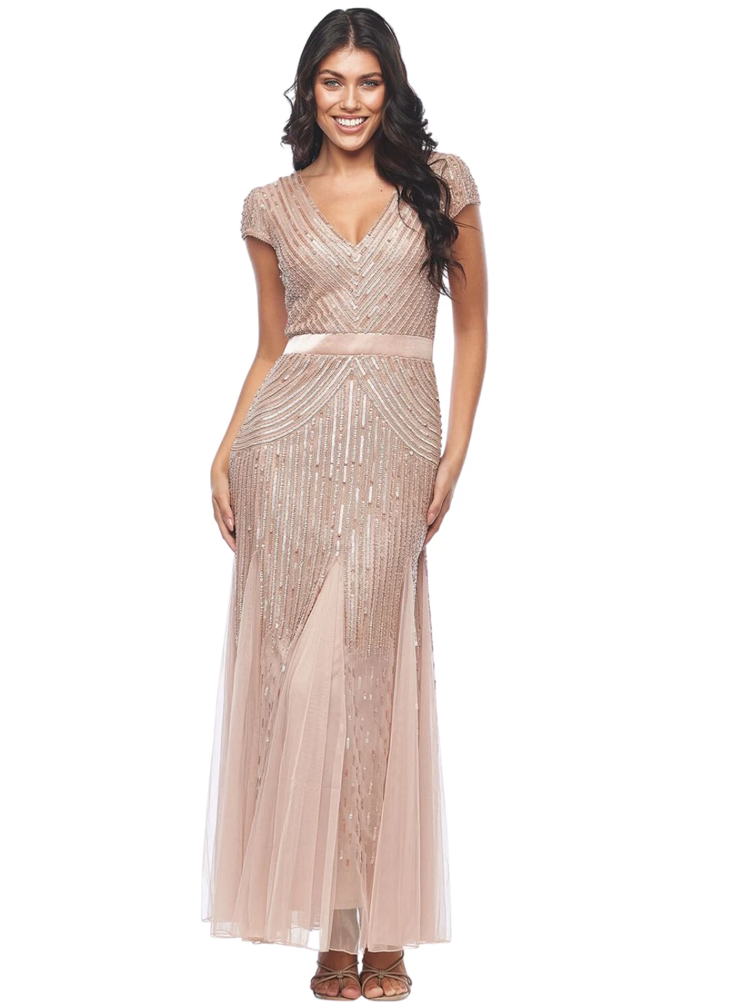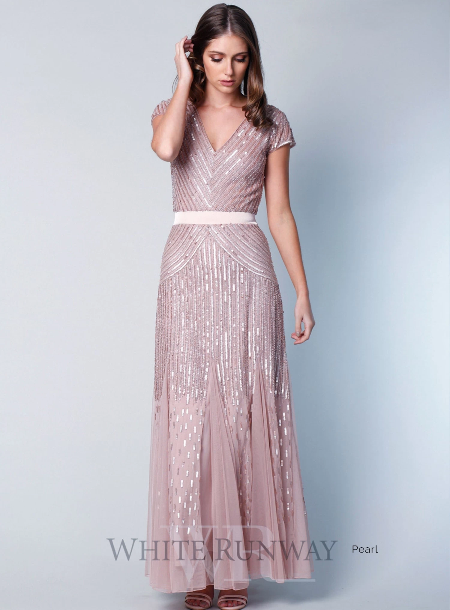 An elegant full length dress by Zaliea. A beautiful style featuring an embellished pattern and cap sleeves.
