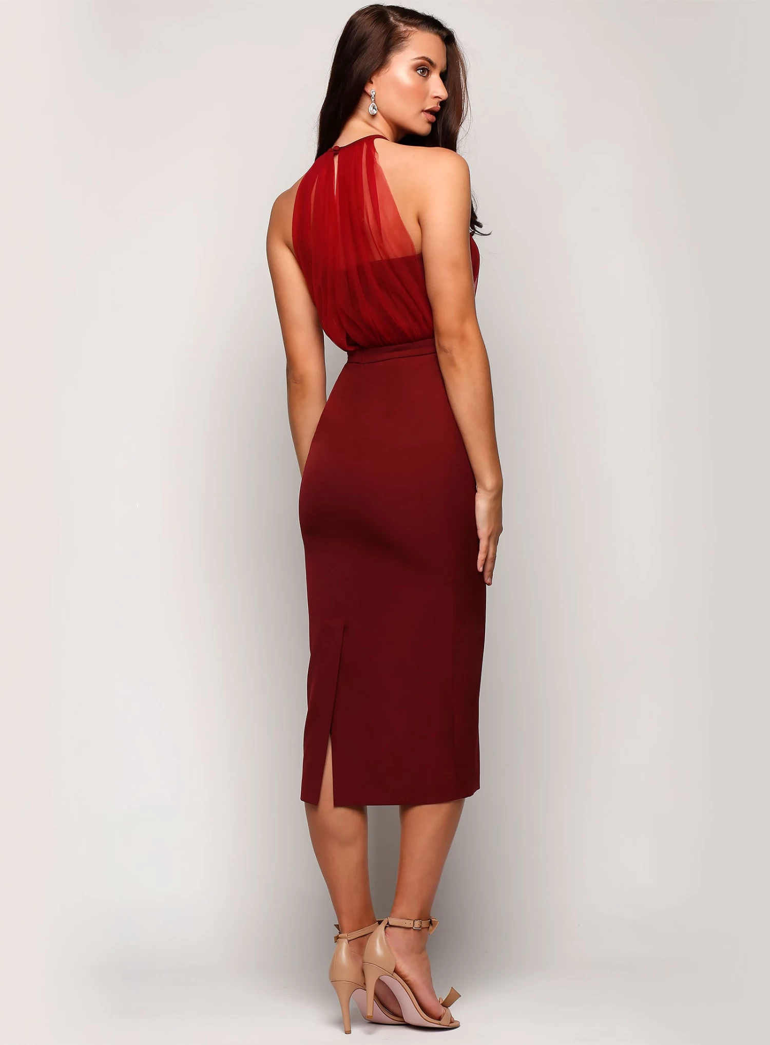 A stylish midi dress by Samantha Rose. Featuring a sweetheart neckline with a high neck illusion tulle detail.
