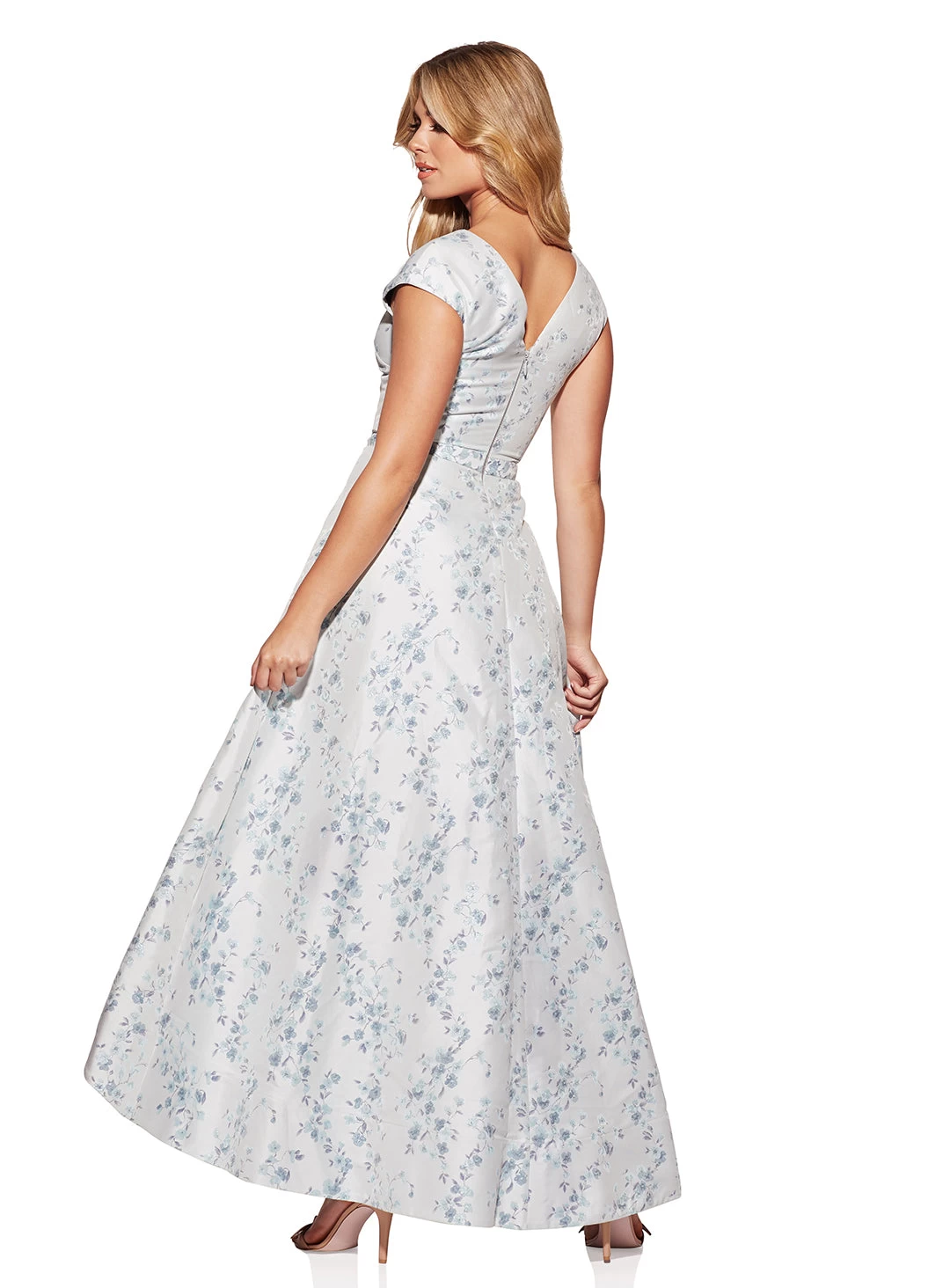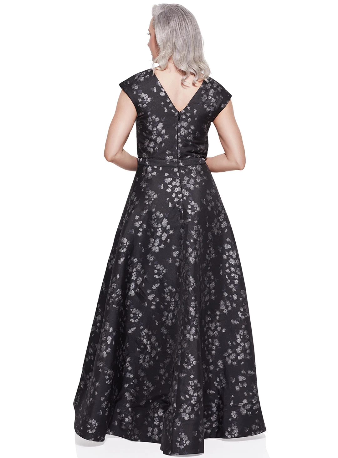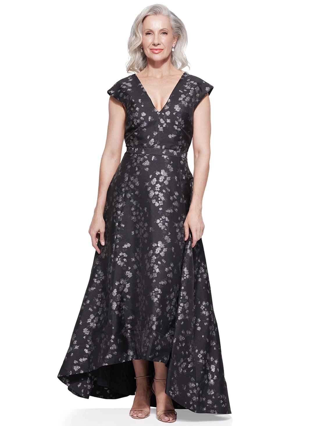 A gorgeous full length dress by Samantha Rose. Made in a brocade fabric, this style features a v-neckline, a high-low full skirt and metallic flower detailing.