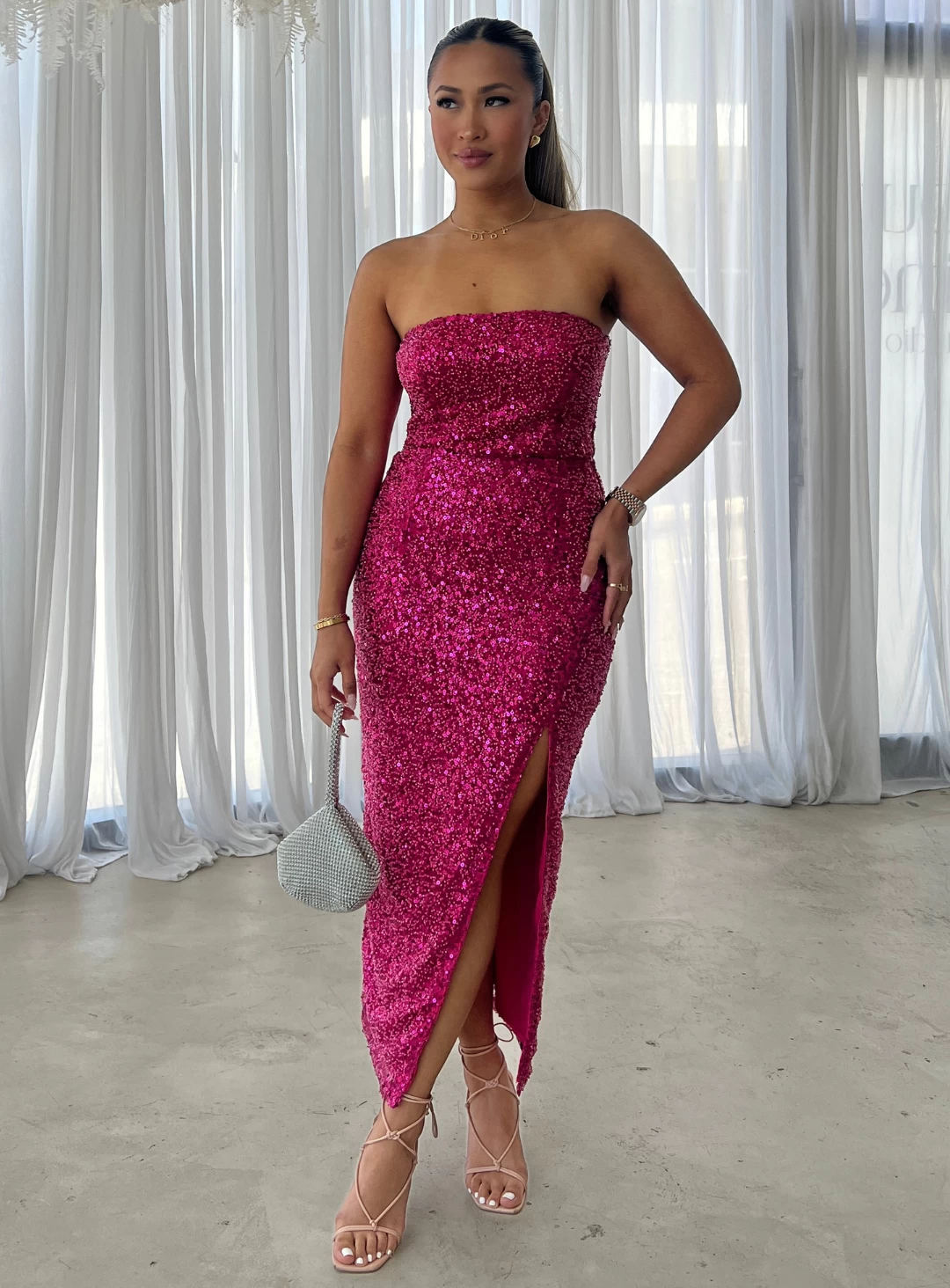 The Anya Dress is a gorgeous midi dress by Elle Zeitoune. A strapless design featuring embellished sequin and a thigh high split.