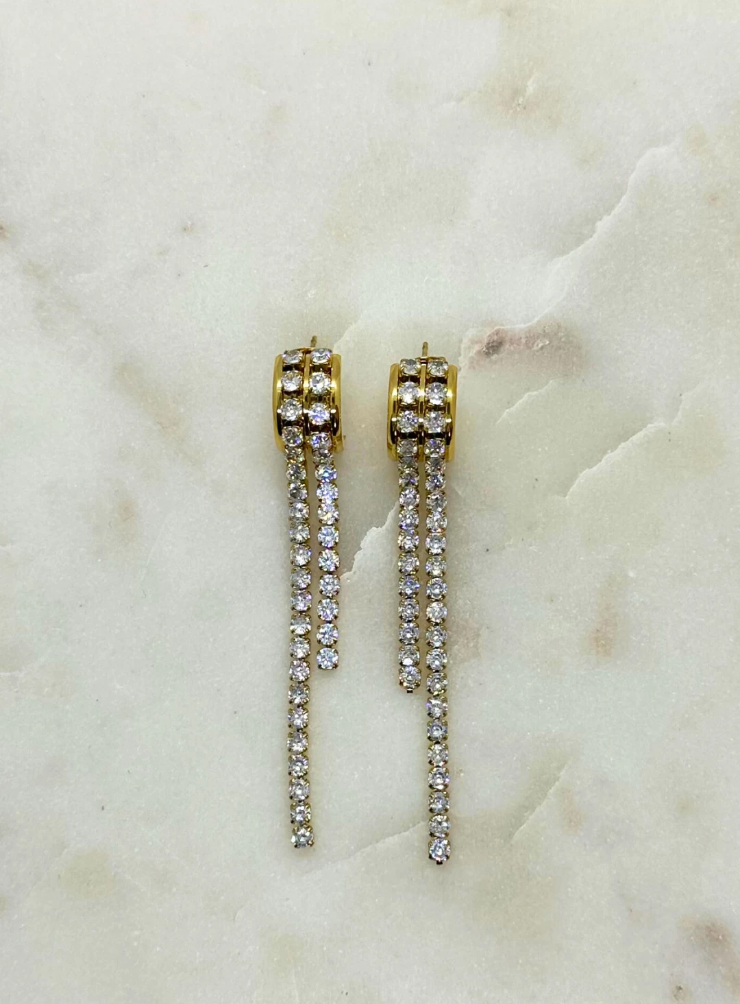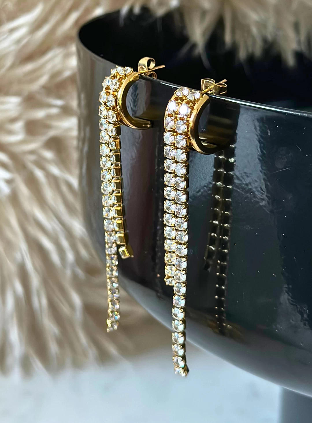 A stunning pair of dangle earrings lined with Cubic Zirconia. Gold hoops with waterfall tassel create the perfect night time earring.