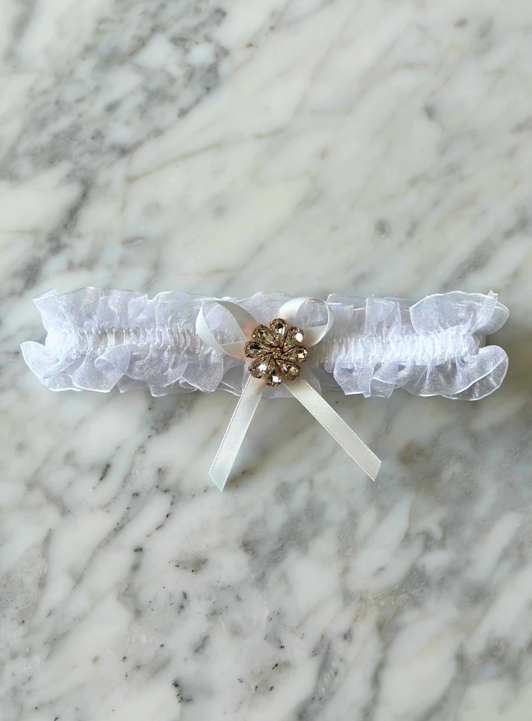 A gorgeous garter by Samantha Rose. A tulle design featuring a simple bow and rose gold broach detailing.