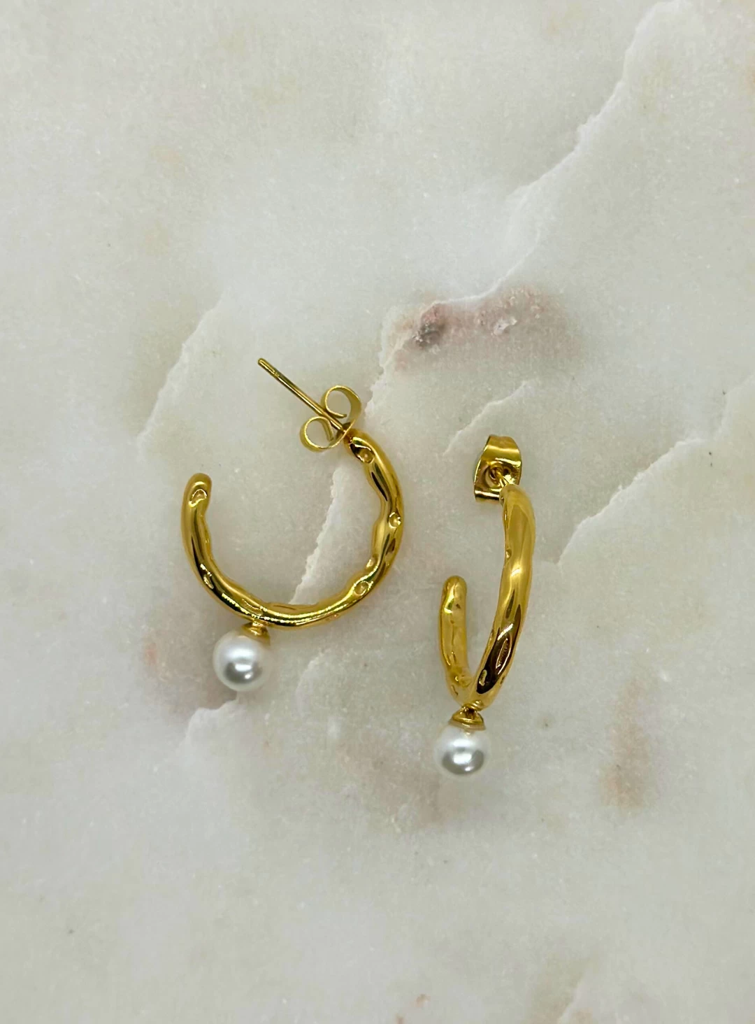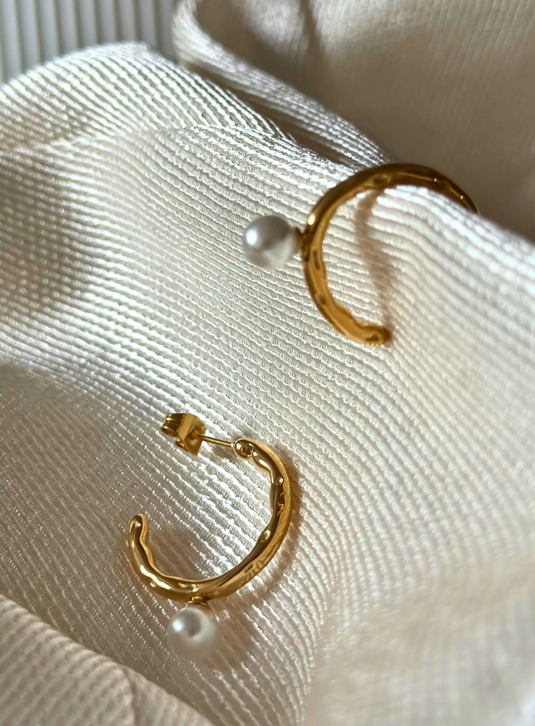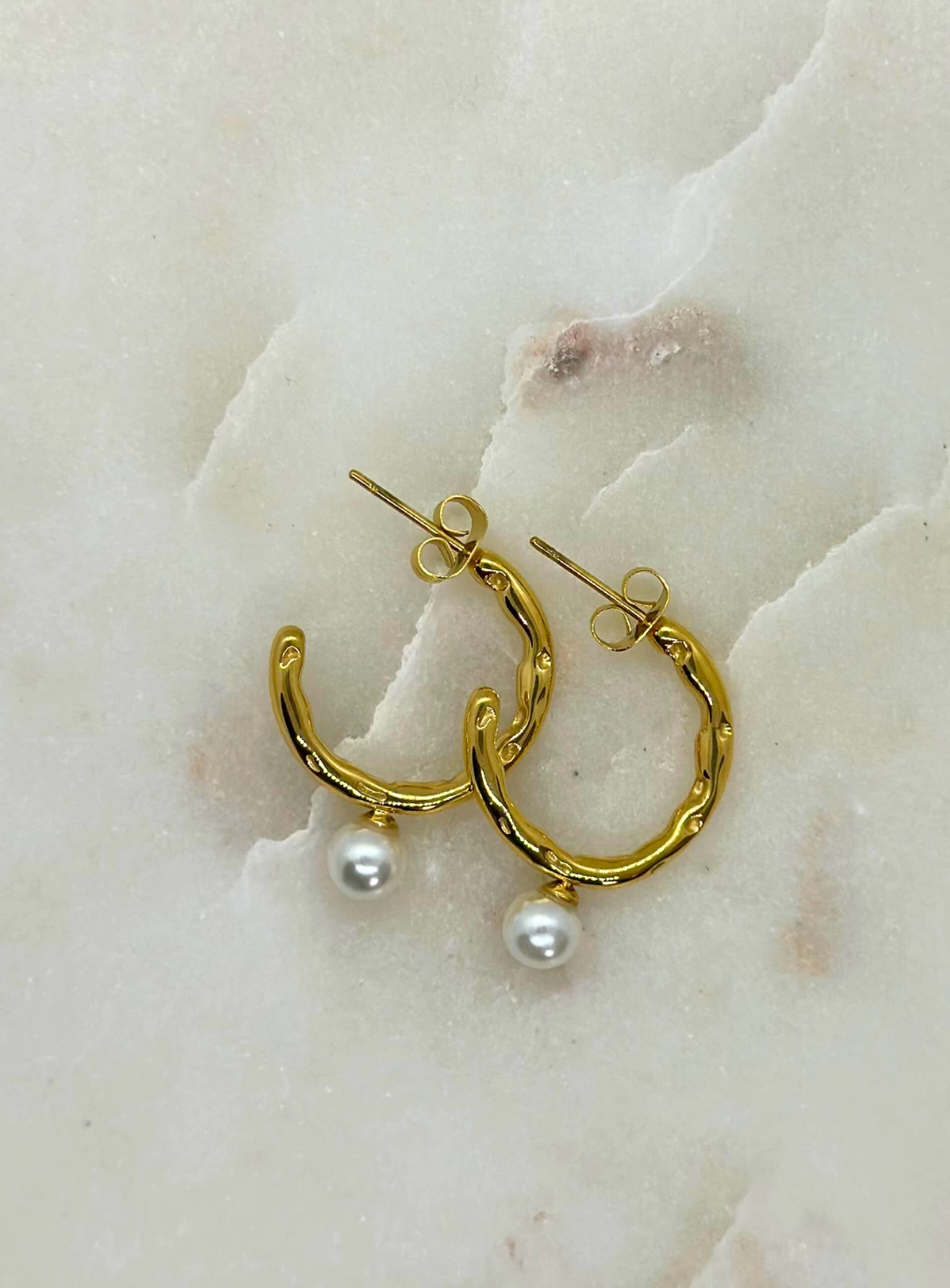 A gorgeous pair of fine gold hoops with pear drop detail and butterfly closure. 18K Gold plated embossed design, perfect for bridesmaids.
