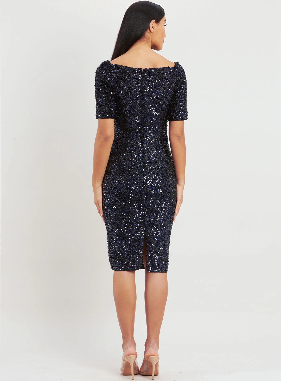 A stunning dress by Romance the Label. A gorgeous design featuring sleeves and crafted in stretch sequin fabric.