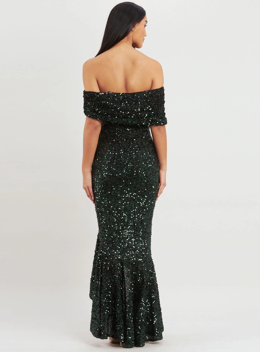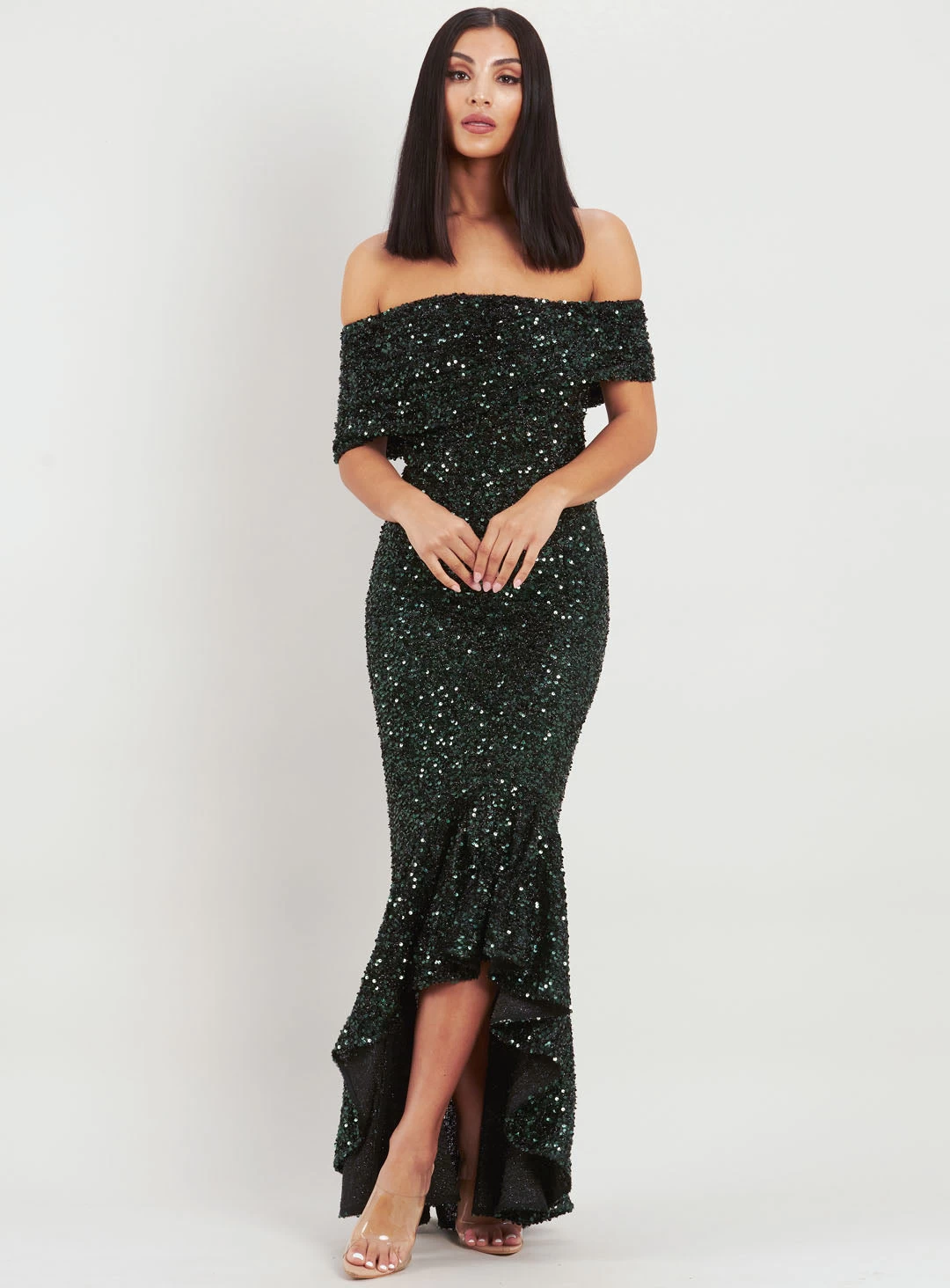 A stunning maxi dress by Romance the Label. An off shoulder design featuring cap sleeves and a mermaid hem.