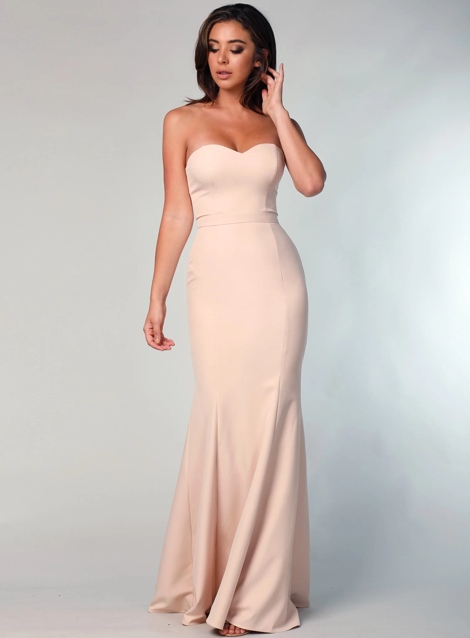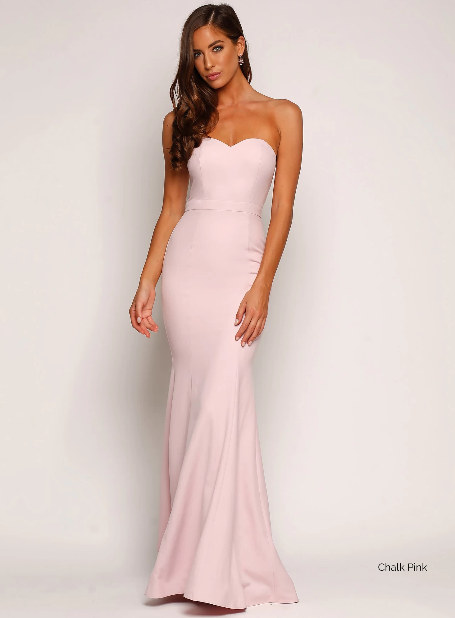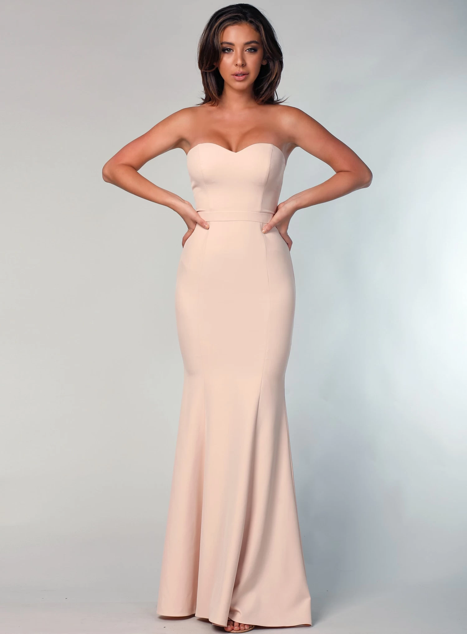 A stunning full length style by Samantha Rose. Featuring a strapless bodice with sweetheart neckline and slim floor length skirt.