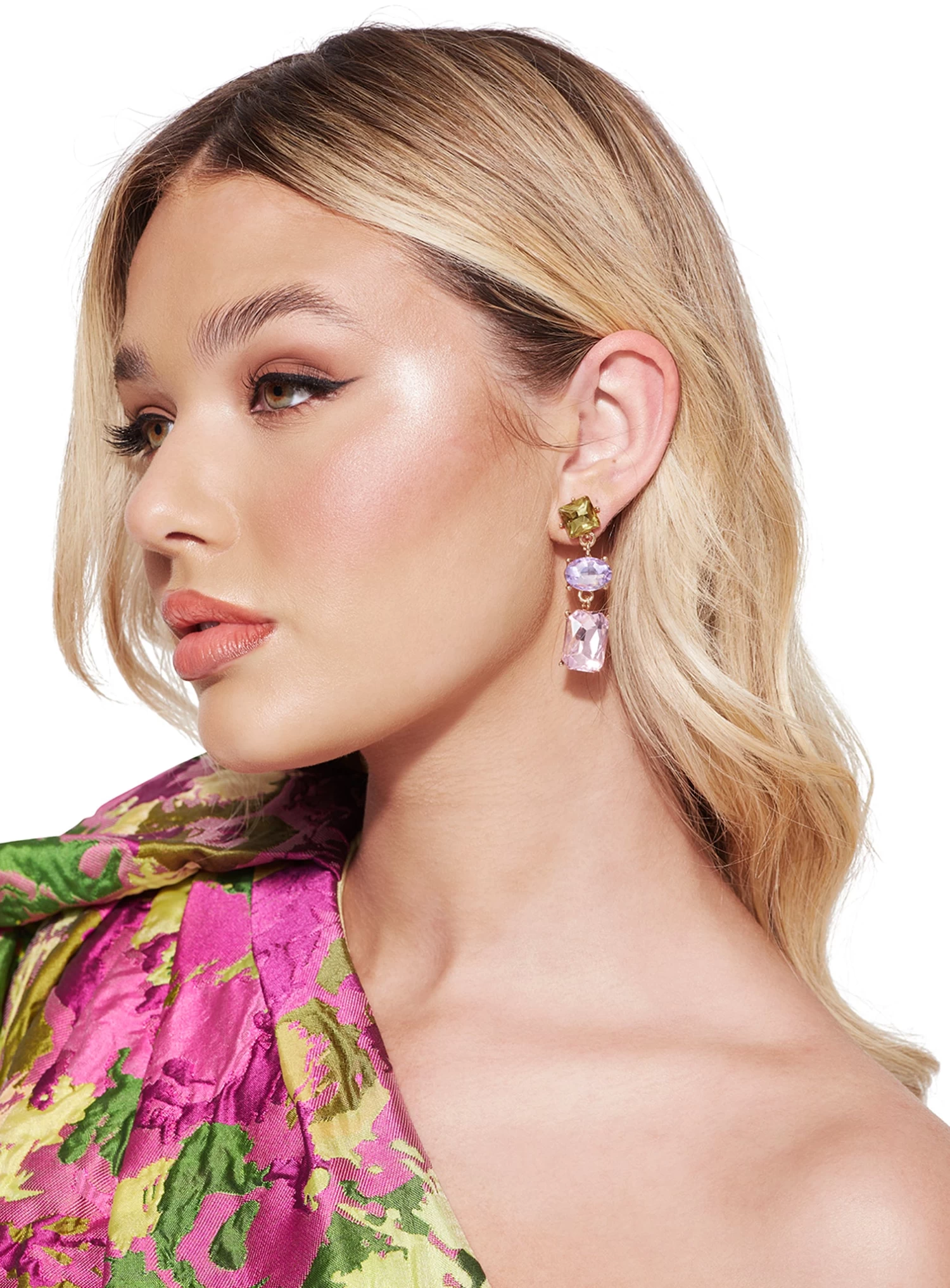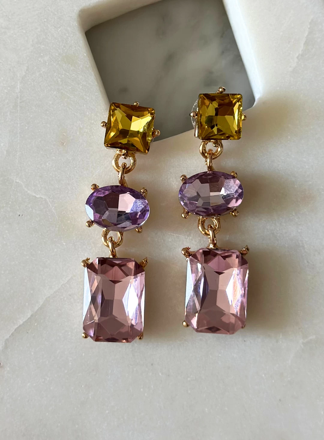 A colourful pair of pendant earrings featuring pink, purple and yellow coloured stones. A statement piece of jewellery for any occasion.