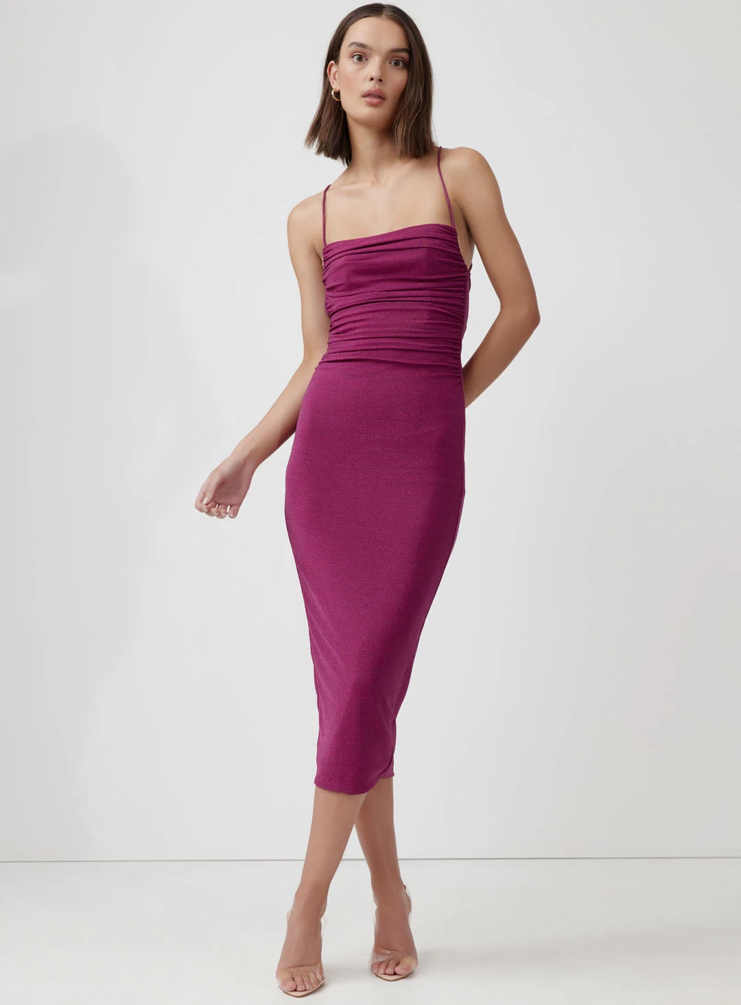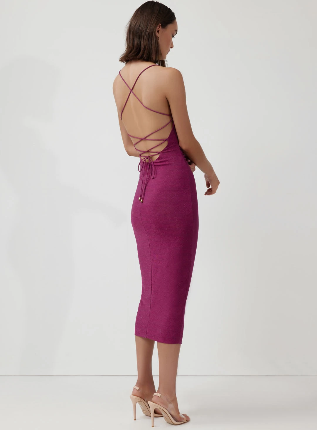 The Sakura dress is a stunning midi by Lexi. Cut from a metallic bodycon fit jersey and is designed to flatter. It features a gathered square neckline with a simple spaghetti strap that is criss crossed at the back and tied into a bow at the waist.