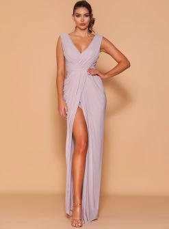 A stunning dress by Les Demoiselle LD1046M. A v-neck style featuring flattering drape detailing on the bust and wrap style skirt.