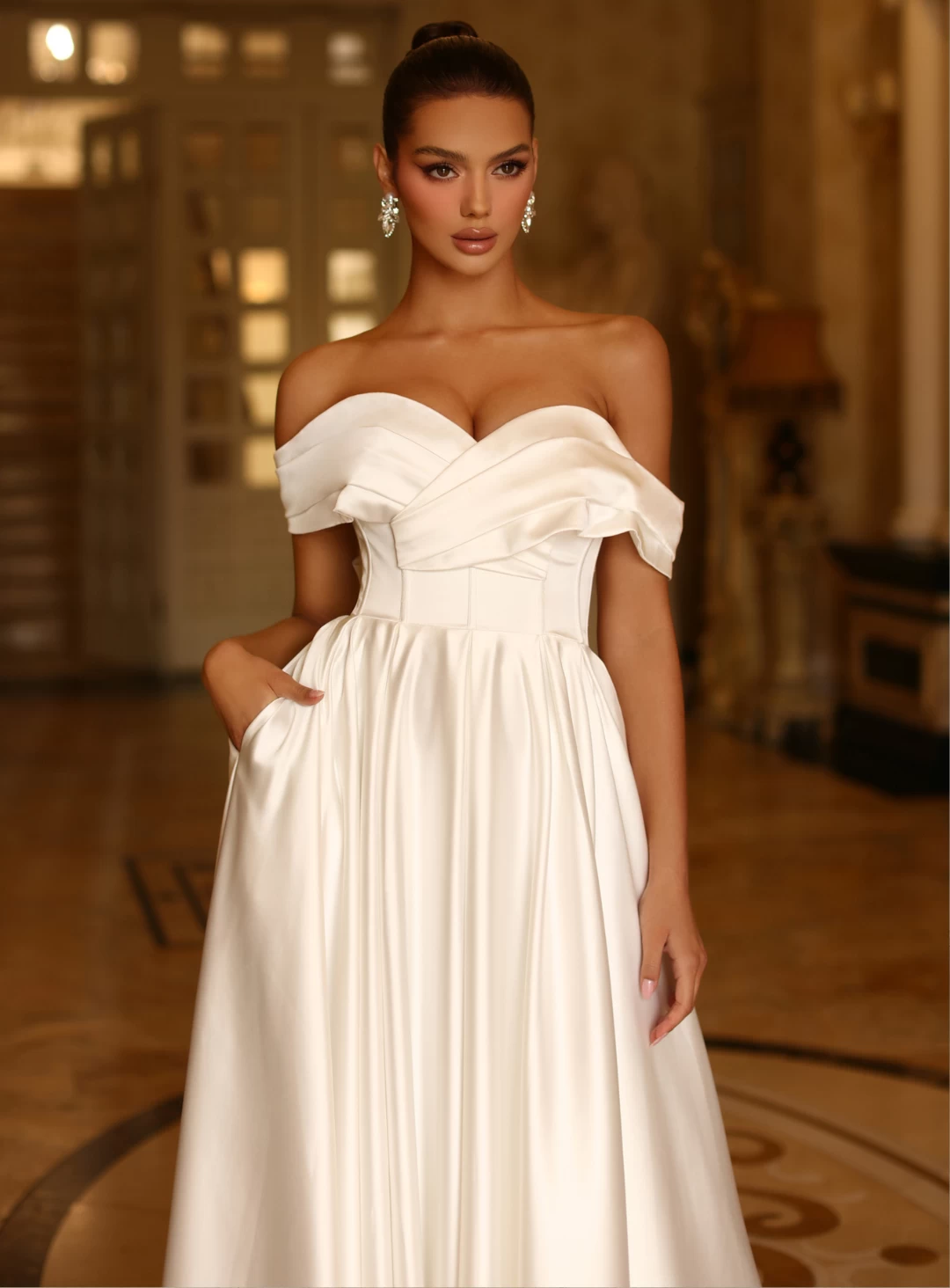 A stunning bridal gown by Tina Holly. An off-shoulder design featuring a sweetheart neckline, structured bodice, bow detailing on the back and a full skirt.