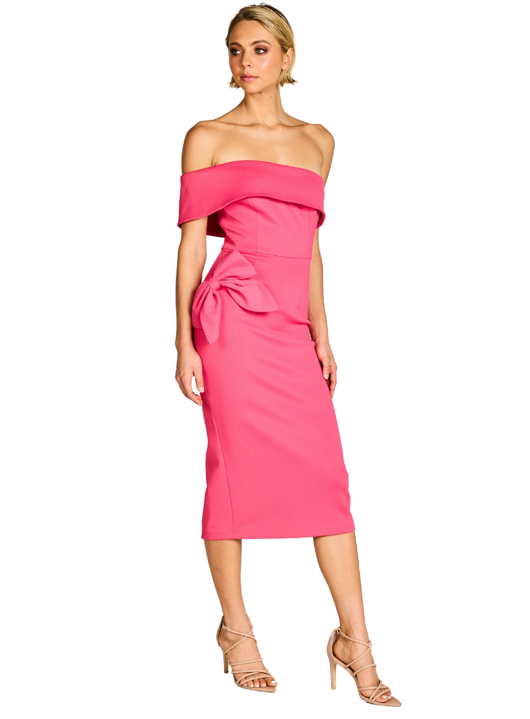 The Serena Bow Dress is a stunning midi dress by Romance the Label. An asymmetric design featuring one off shoulder sleeve and a bow applique on the waist.