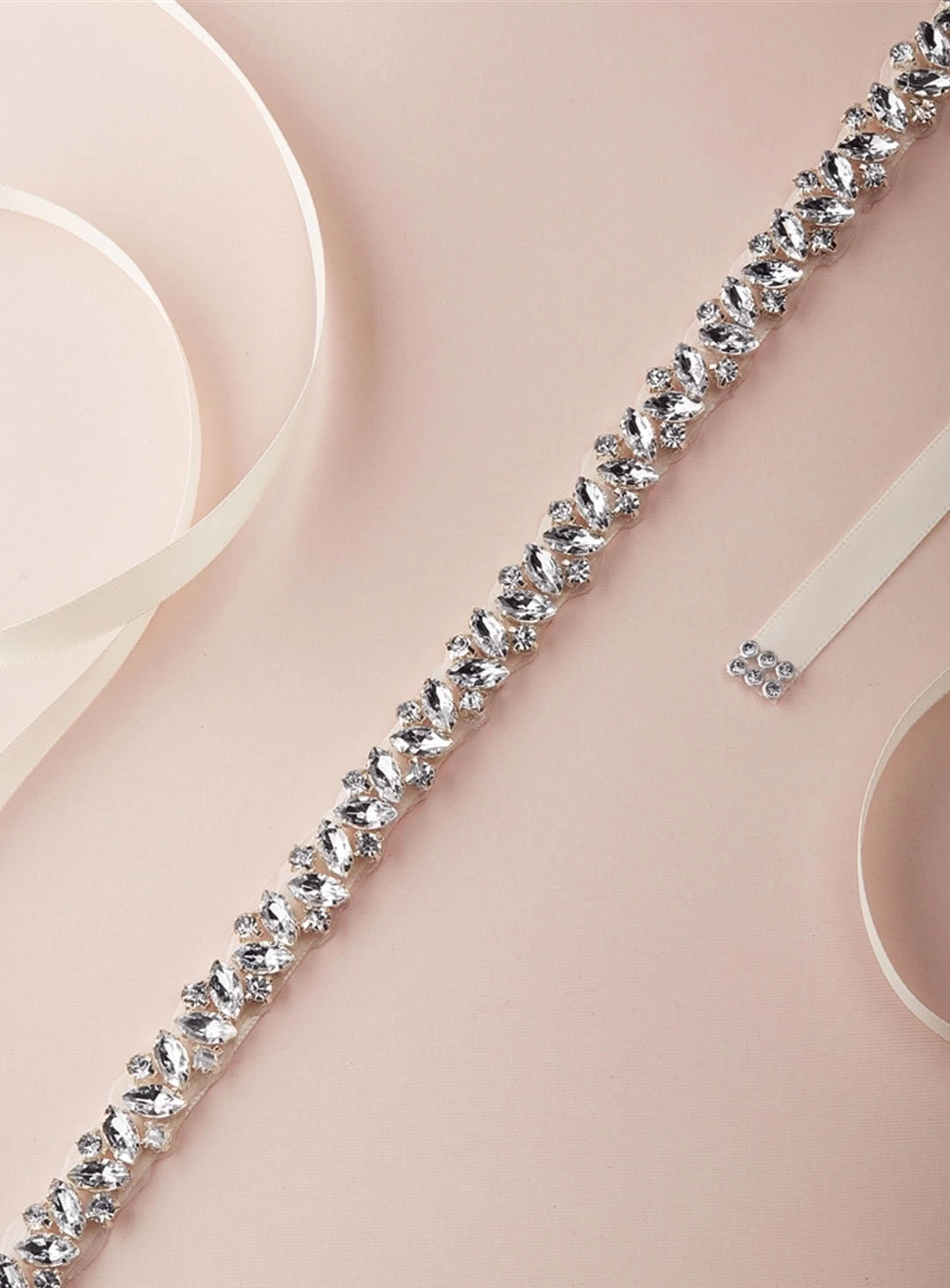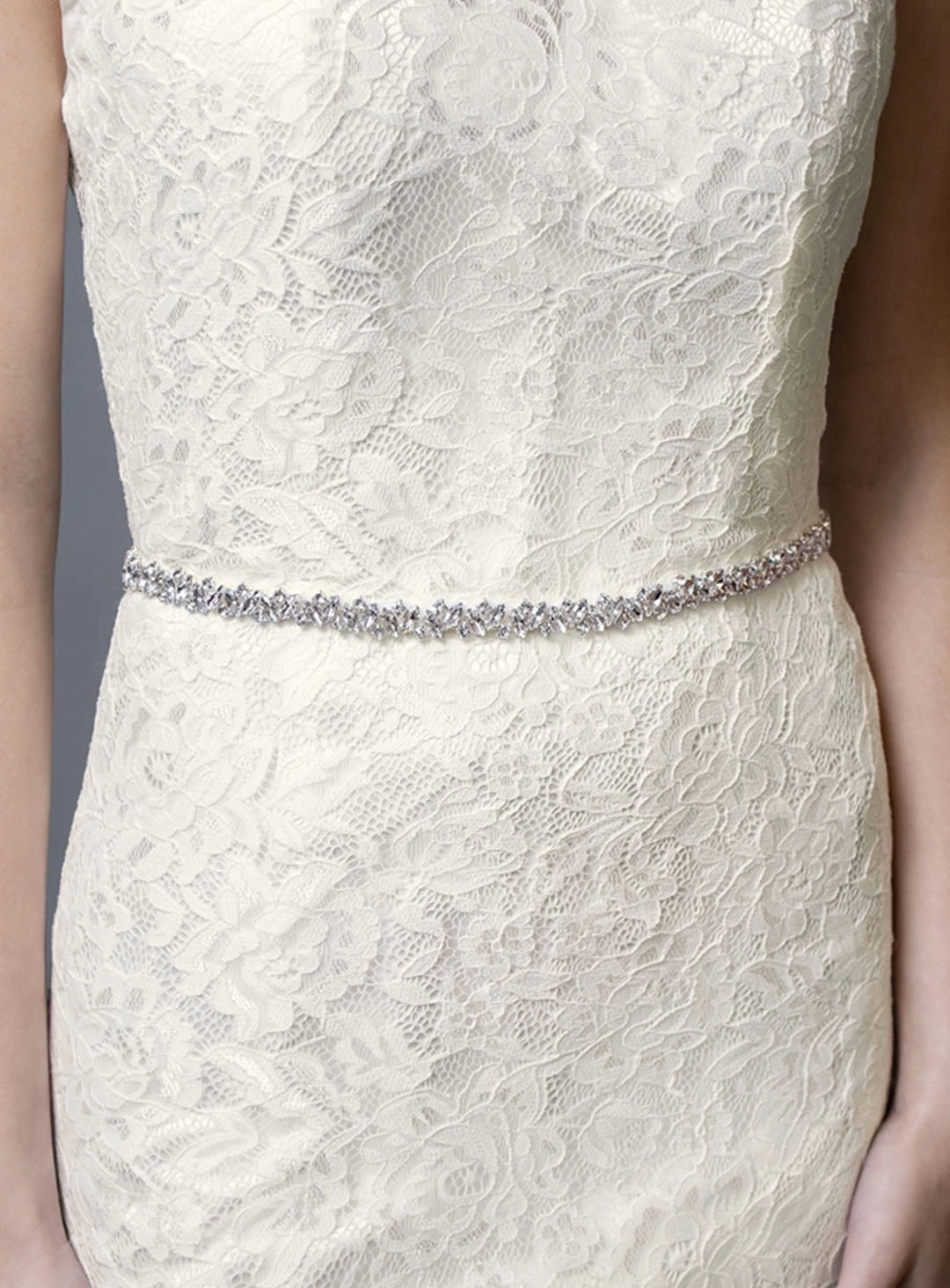 Delicate beaded belt by Mariell. Features fiery Austrian crystals and rhinestoes set in a stunning silver applique. The crytal design measures 18″ across and 1/2″ wide. Total belt is 3/8″ wide and 107 1/2″ long.