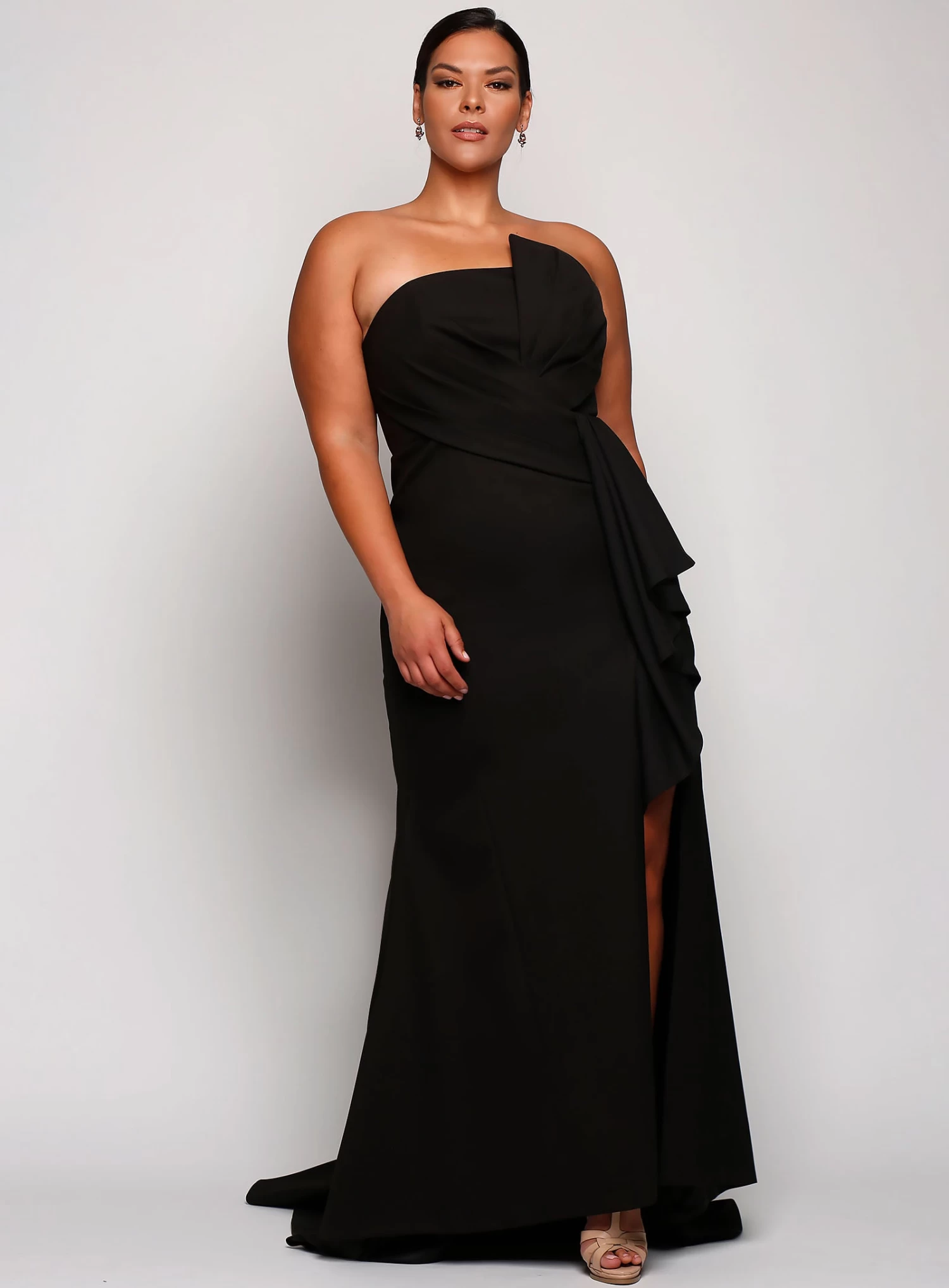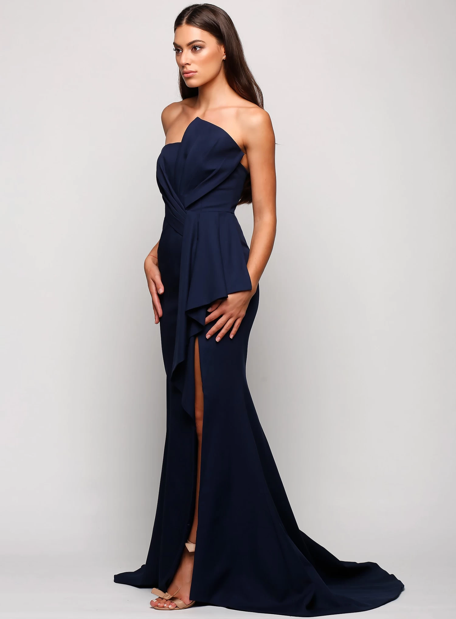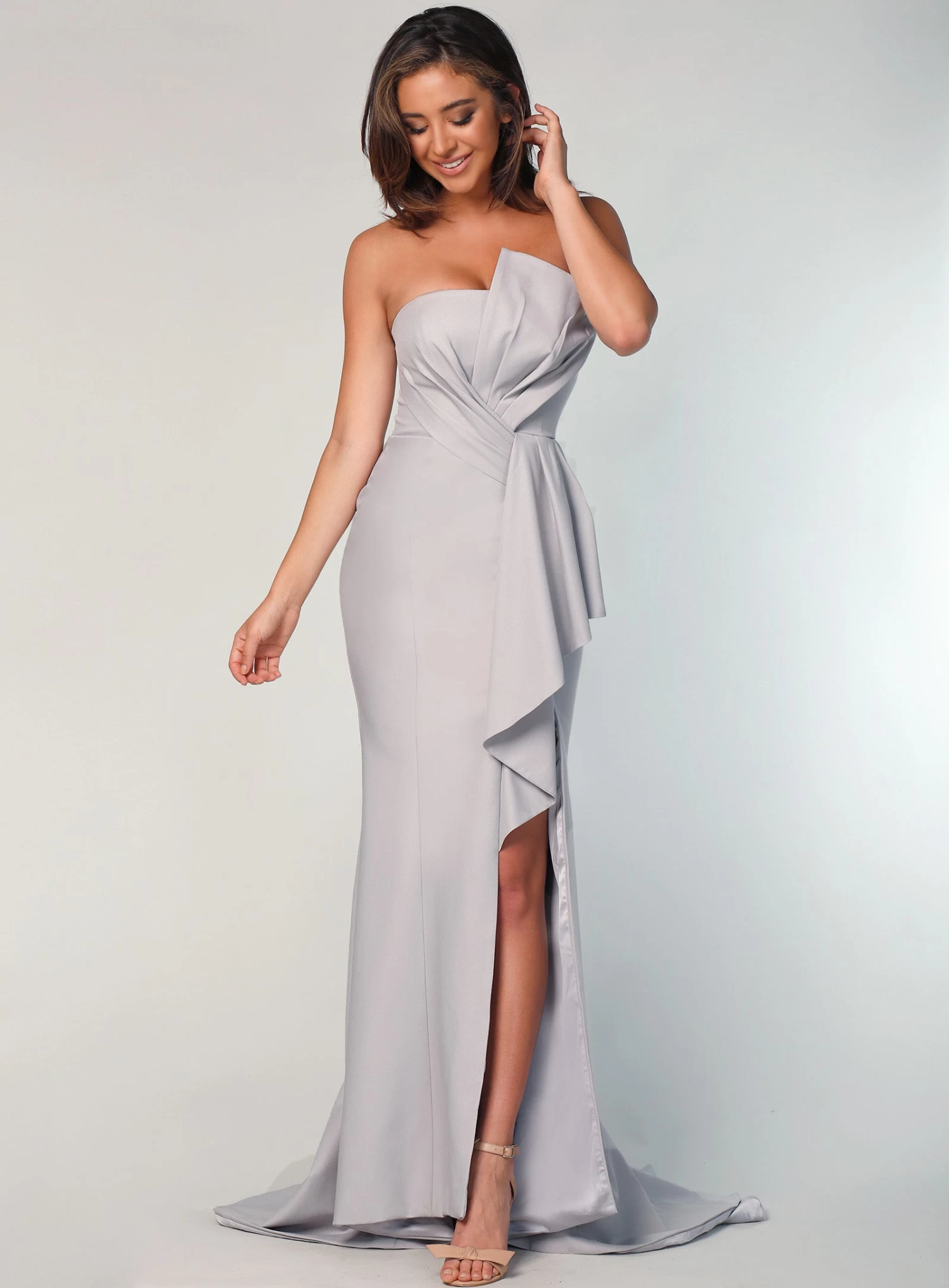 A stunning full length gown by Samantha Rose. Featuring a strapless style bodice with bodice and waist detailing.