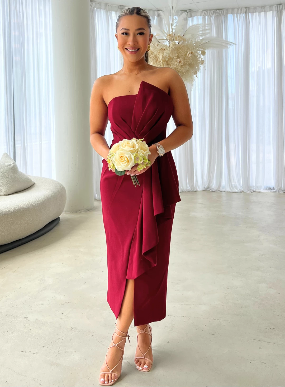 A gorgeous cocktail length dress by Australian designer Samantha Rose. A strapless style featuring 3D ruffle on the neckline and waist. Comes with detachable straps.
