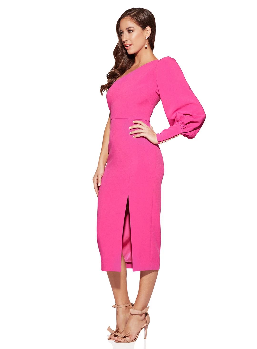 A gorgeous midi dress by Samantha Rose. Made from a thick stretch crepe fabric, this one sleeve style is super flattering with a puff sleeve and a thigh high split.