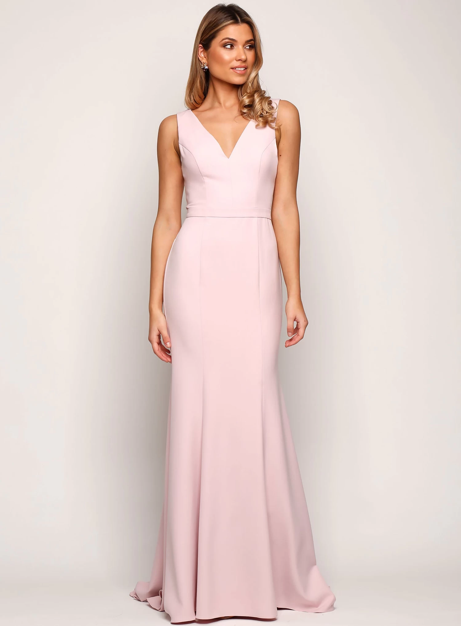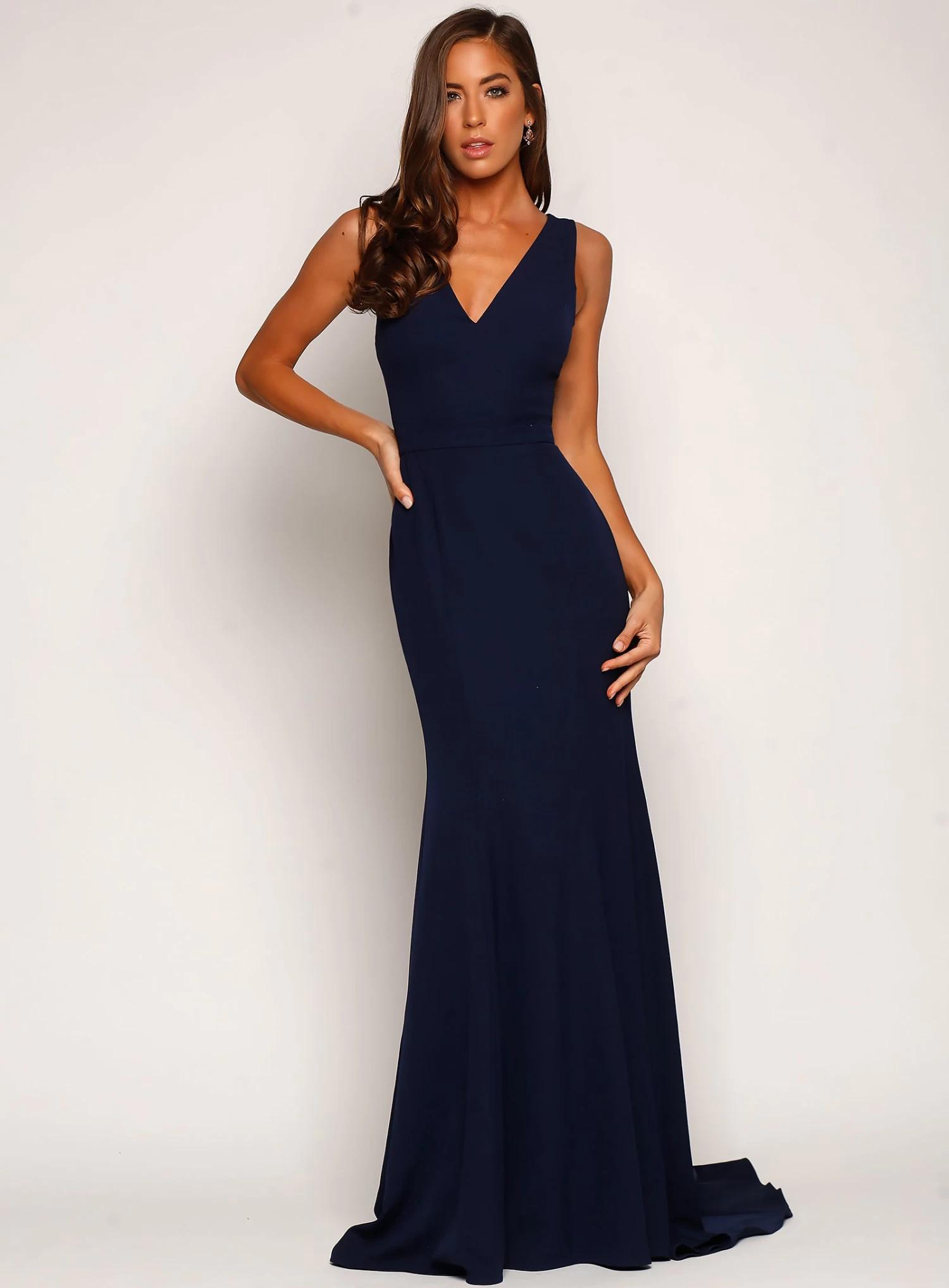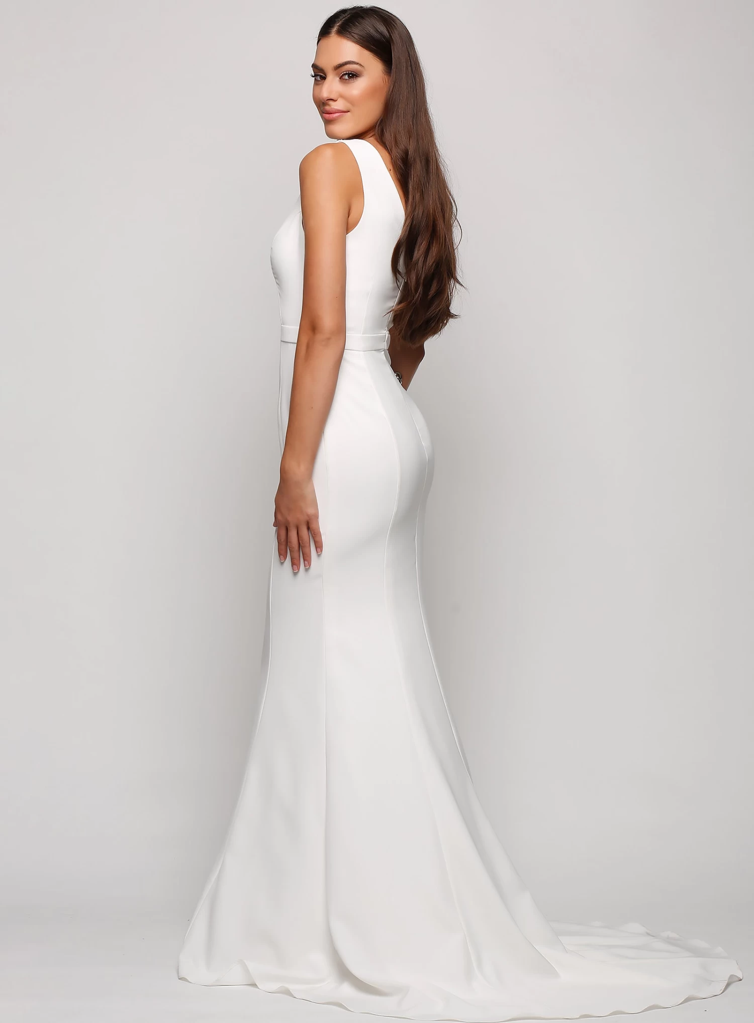 A beautiful full length gown by Sofia Cali. A flattering style featuring a v neckline and back with thick shoulder straps and a floor sweeping train.
