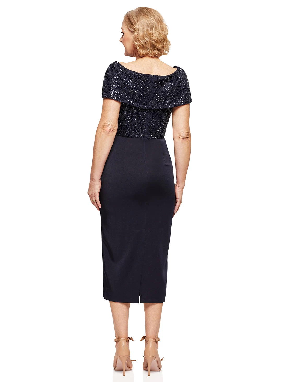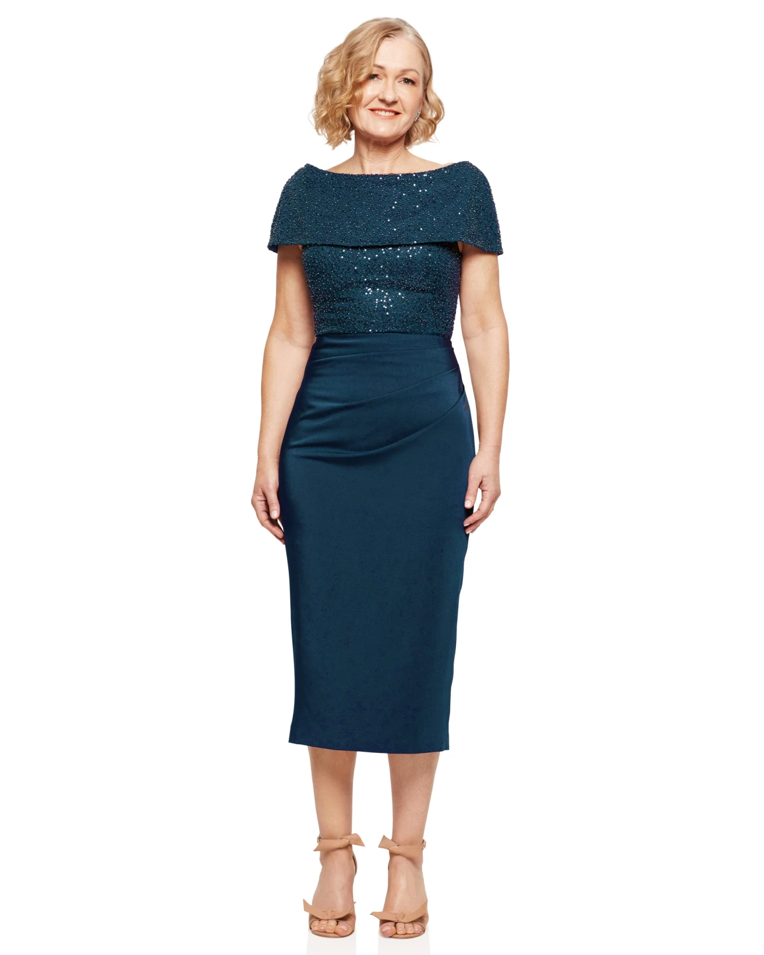 A gorgeous midi length dress by Trellis Lane. Features a beaded bodice with off the shoulder overlay. Skirt is made from a woven satin crepe with flattering ruched details.